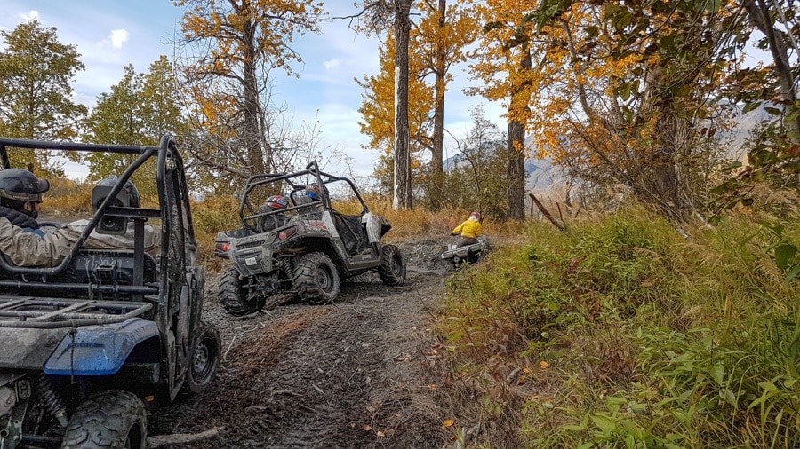 As guide Shane readied the ATVs in the parking lot, we paired up and geared up. They furnish helmets, goggles, and various other gear if you don’t have it, but dress with the idea that you are going to get muddy and wet! Brian and Shane showed us how to operate the ATV, and our group roared off on the 22 miles of ATV trails headed toward the Glacier.