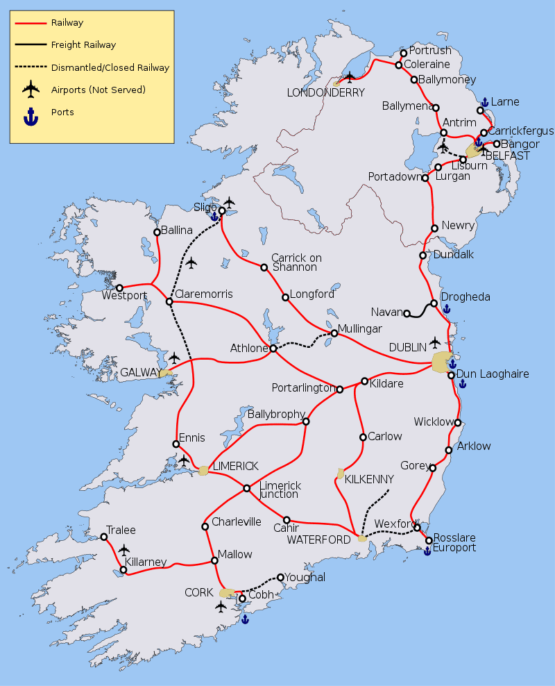 Irish Rail (Iarnród Éireann) operates the national railway network, connecting bigger cities and towns nationwide. It is less extensive than other European networks. Key routes include: