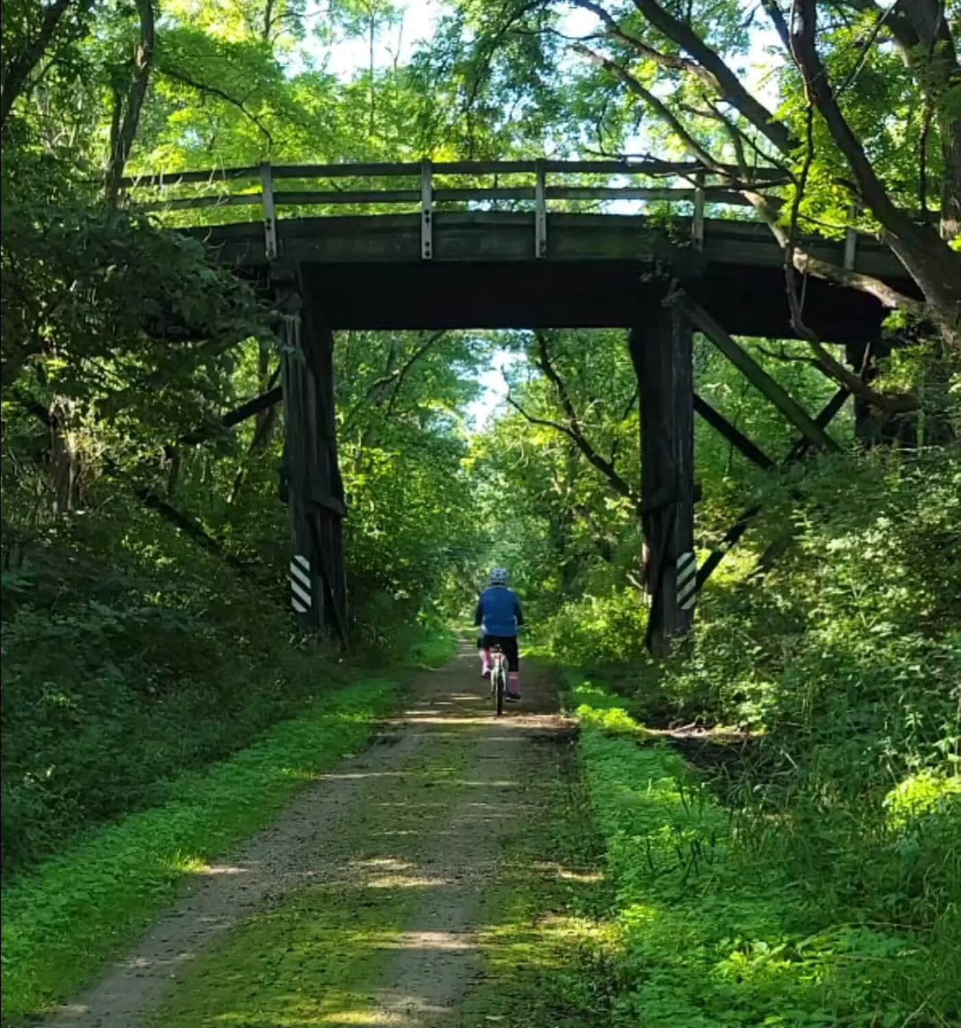 The rail trail is gravel/crushed stone, so you will need more rugged tires. The majority of the trail was flat or very gradual grades since it was an old rail line. In addition to the cute trestle bridges, it seemed like most of the time, you were protected in the shade of a canopy of big trees. I ran into a number of other cyclists and bikers along the trail, too, which made it fun. Consider obtaining trail maps, and remember you will need to purchase a state trail pass for $5.