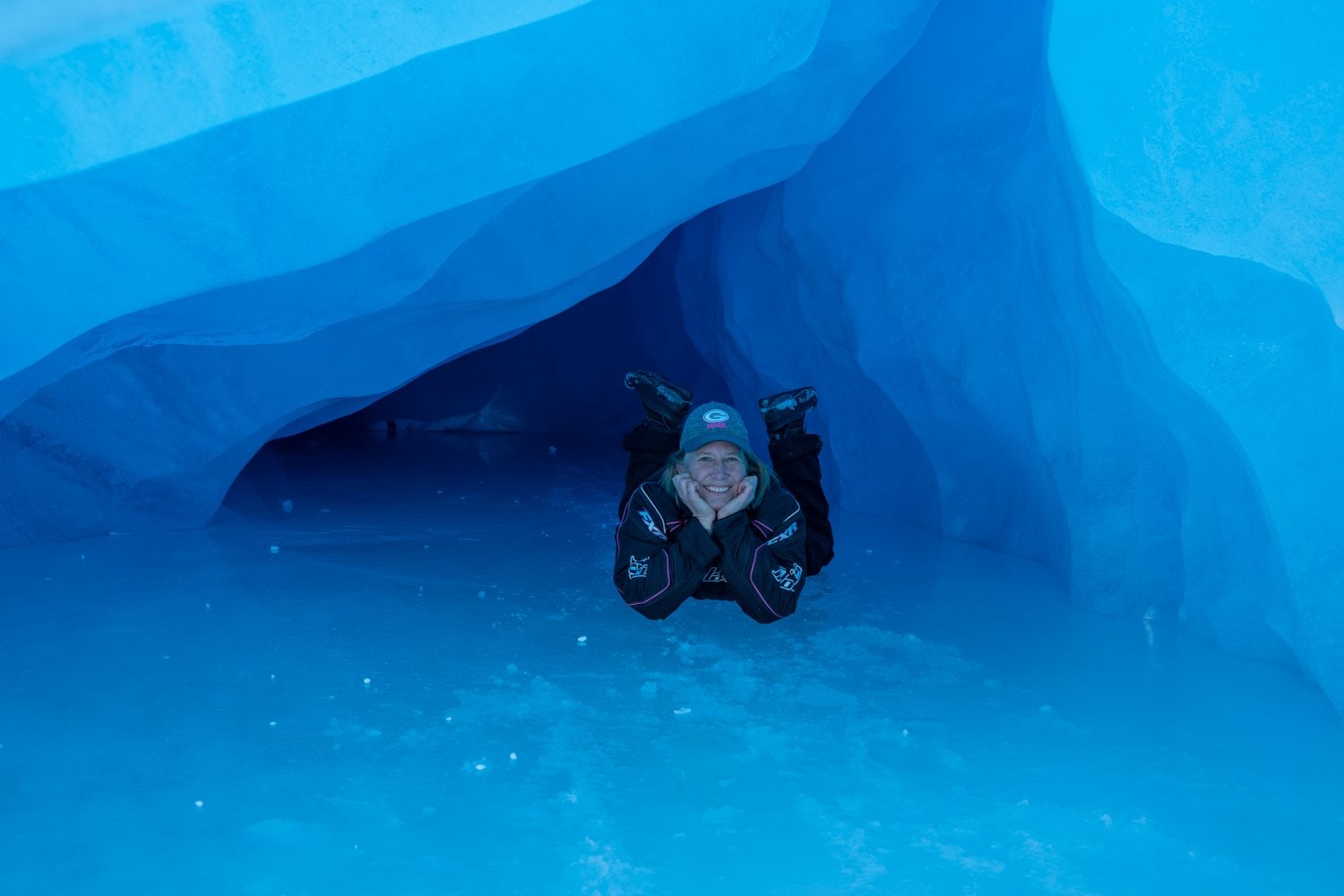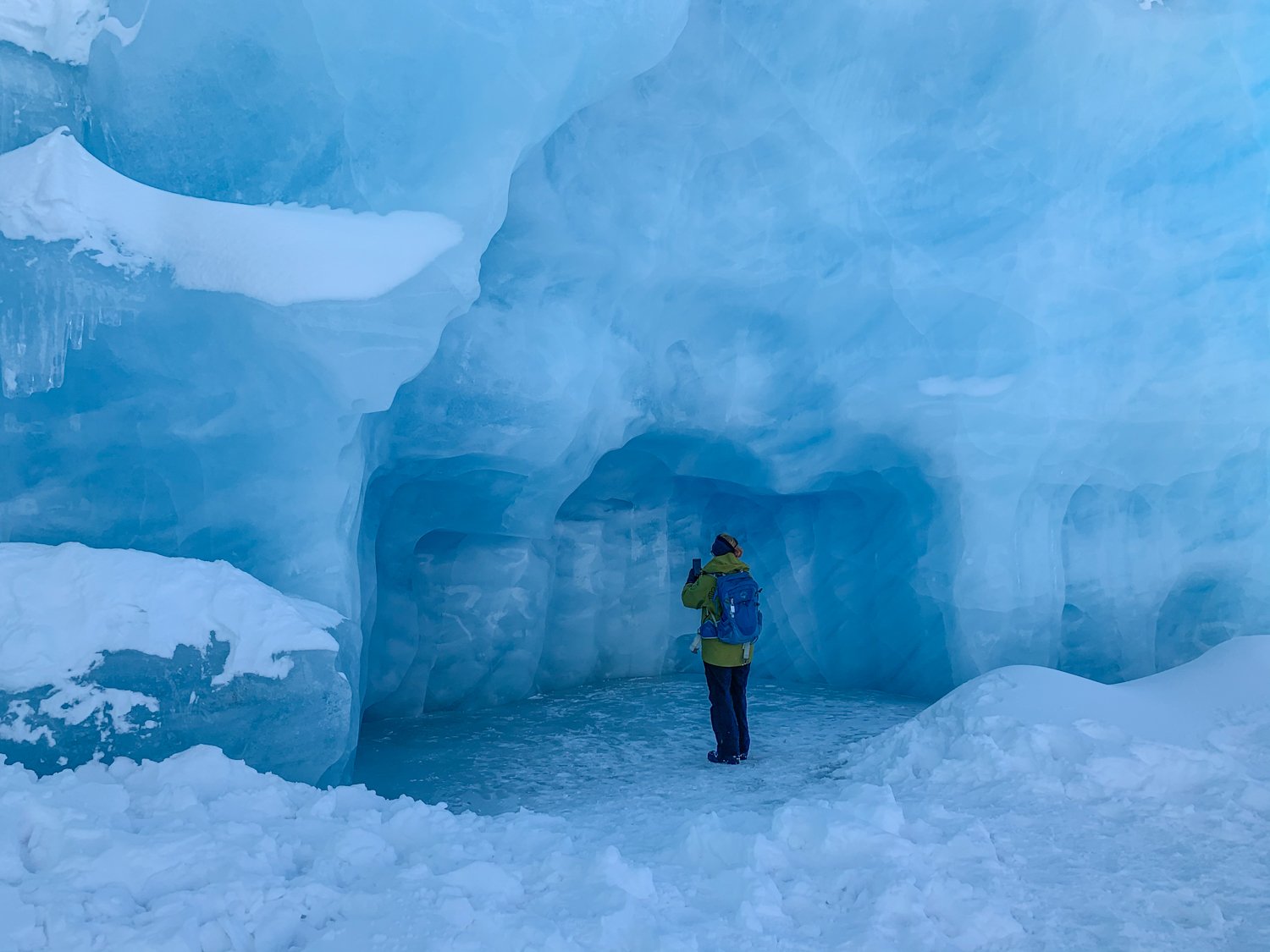 This time, I snowmobiled OVER the frozen lake, past the big icebergs frozen in place on the lake, and right to the terminus of the frozen glacier. We could walk on the icebergs, go in ice caves, and be in awe of the dense blue ice under the watchful eyes of our guides, who directed us on which areas were safe.