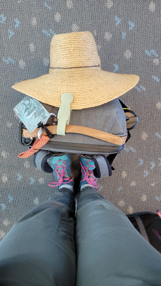 Sometimes hats are really hard to travel with, but I suggest getting a Klipsta to attach your hat with a big brim to your carry-on bag when not wearing it. Or a carabiner will work too for baseball hats. Sometimes I also pack my hats in my suitcase and then pack rolled clothing around them so they can keep their shape.