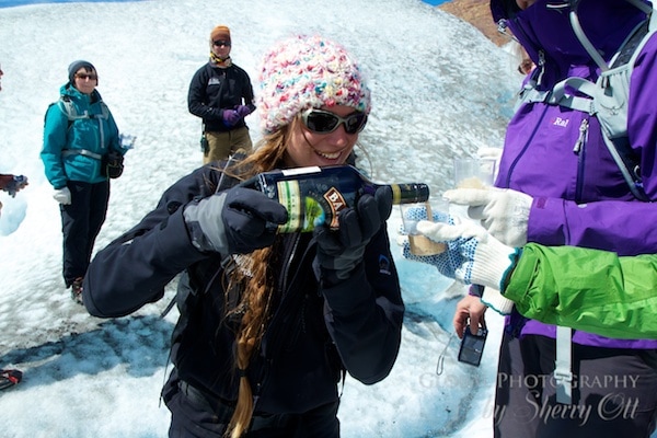 Viedma – The crampons were good quality and they had toe picks which allowed you to go up steeper walls. They also furnished gloves for those who didn’t have their own. We had 3 English speaking guides for our group and they were the energetic, upbeat, and always there when you needed a hand. In fact they moved so fast on the ice that they snuck up on me many times! They encouraged you to try things slightly out of your comfort zone and would give you extra support if you looked nervous. They also took a lot of time to explain the history and geology of the glacier which I found fascinating. I was really impressed with how nimble and adventurous the group of them was. About ¾ of the way through the trek the guides surprised us with a bottle of Baily’s that they poured over glacial ice for a little celebration – a real treat!